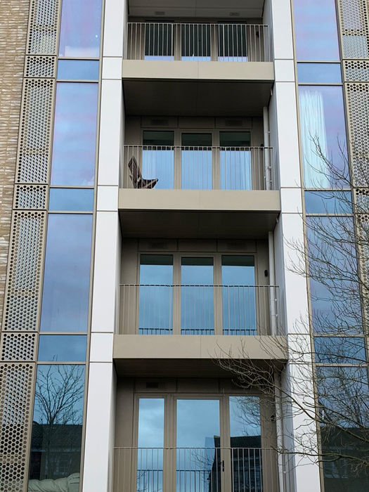 A strict void clearance procedure was implemented to ensure M&E trades works were complete prior to panelling out the facades. For the Extract Duct Interface, we were able to design and manufacture removable mesh grilles located within the cladding panels to allow for the periodic removal and cleaning of the vents from the external side. We also designed and installed aluminium drip trays for the exposed balconies to deflect rainfall through the decking into the M&E trades drainage routes